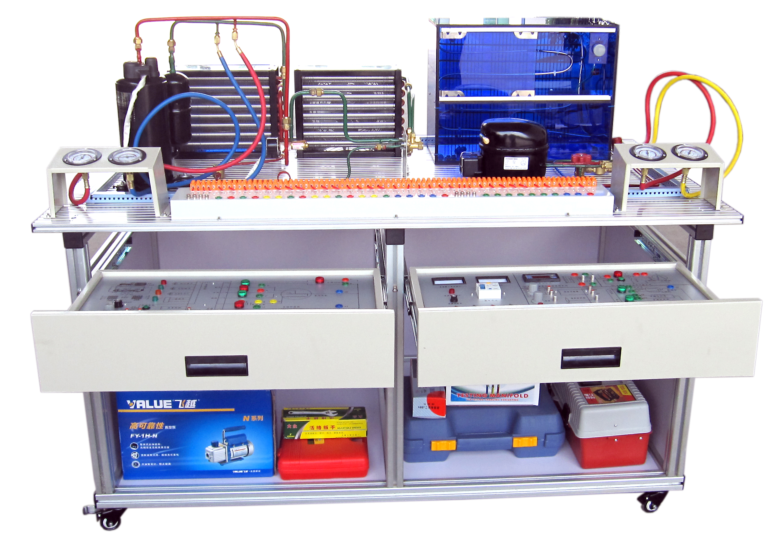 制冷制熱實(shí)訓(xùn)設(shè)備、制冷制熱實(shí)訓(xùn)裝置是職業(yè)技能課程制冷制熱教學(xué)實(shí)訓(xùn)設(shè)備,冰箱實(shí)訓(xùn)設(shè)備、空調(diào)實(shí)訓(xùn)設(shè)備主要承擔(dān)電類專業(yè)的《制冷制熱技術(shù)》等課程的實(shí)訓(xùn)教學(xué)任務(wù),同時(shí)可面向社會(huì)開展制冷設(shè)備維修工(中、高級(jí))和家用電器產(chǎn)品維修工(中、高級(jí))職業(yè)技能培訓(xùn)與鑒定工作。制冷制熱實(shí)訓(xùn)設(shè)備屬于教、學(xué)、做一體化實(shí)訓(xùn)室,制冷制熱儀器設(shè)備可供學(xué)生完成《制冷制熱技術(shù)》等課程的實(shí)訓(xùn)教學(xué)。主要可對(duì)學(xué)生開展冰箱電氣檢修、空調(diào)檢修、空調(diào)移機(jī)、制冷劑加注、管路操作等實(shí)訓(xùn)內(nèi)容,并具備制冷維修工技能鑒定資質(zhì)。教學(xué)做、理實(shí)一體化,增加了師生之間的互動(dòng),提高了教學(xué)效果。在組裝調(diào)試過(guò)程中,學(xué)生遇到故障問(wèn)題,指導(dǎo)老師幫助其分析故障原因,指導(dǎo)學(xué)生動(dòng)手解決故障問(wèn)題。制冷制熱實(shí)訓(xùn)裝置特色是:實(shí)訓(xùn)設(shè)備全面的涵蓋了制冷、制熱等電器的所有原理性電路,既能夠讓學(xué)生迅速融入實(shí)物學(xué)習(xí)的外觀體現(xiàn),也能夠?qū)﹄娖鞯慕Y(jié)構(gòu)和組成有清楚的認(rèn)識(shí)。實(shí)訓(xùn)室有大量的舊冰箱、空調(diào)實(shí)物可供學(xué)生拆卸、組裝,讓學(xué)生對(duì)制冷制熱設(shè)備有更加深刻的理解。通過(guò)實(shí)制冷制熱實(shí)訓(xùn)教學(xué),可使學(xué)生熟悉常用儀器儀表,熟練使用儀器儀表,更好的掌握制冷制熱裝置的維修技術(shù),為以后的發(fā)展奠定基礎(chǔ),從而提高學(xué)生實(shí)際動(dòng)手能力和就業(yè)競(jìng)爭(zhēng)力。制冷設(shè)備運(yùn)用與維修,培養(yǎng)在制冷與空調(diào)制造行業(yè),從事產(chǎn)品設(shè)計(jì)、技術(shù)管理與質(zhì)量管理;在制冷與空調(diào)設(shè)備經(jīng)營(yíng)行業(yè),從事產(chǎn)品的銷售、售后服務(wù)和經(jīng)營(yíng)管理;在制冷與空調(diào)設(shè)備使用單位,從事制冷與空調(diào)系統(tǒng)運(yùn)行管理和操作維修的中、高技能人才。制冷技術(shù)、制冷基礎(chǔ)技能實(shí)訓(xùn)、冰箱、家用空調(diào)器原理與維修、工程熱力學(xué)、電工基礎(chǔ)及實(shí)訓(xùn)、電力拖動(dòng)原理與技能實(shí)訓(xùn)、工程制圖與CAD、中央空調(diào)運(yùn)行管理與維護(hù)、汽車空調(diào)安裝及維修、冷庫(kù)設(shè)計(jì)安裝與維護(hù)、制冷空調(diào)自動(dòng)控制技術(shù)等課程。畢業(yè)就業(yè)方向:空調(diào)生產(chǎn)企業(yè)的質(zhì)檢、工藝、基層管理、生產(chǎn)設(shè)備維護(hù)工作,中央空調(diào)、冷庫(kù)的安裝、運(yùn)行管理、維護(hù),空調(diào)工程的預(yù)算、輔助設(shè)計(jì)工作,空調(diào)、冷庫(kù)和制冷設(shè)備等空調(diào)制冷行業(yè)的營(yíng)銷、銷售代理、售后服務(wù)工作。 上海碩博弘揚(yáng)大國(guó)工匠精神, 發(fā)展職業(yè)教育,應(yīng)用教學(xué)設(shè)備,為企業(yè)培養(yǎng)高技能人才,而專業(yè)生產(chǎn):制冷與空調(diào)實(shí)訓(xùn)設(shè)備、可視化制冷性能測(cè)試培訓(xùn)裝置、一機(jī)兩庫(kù)系統(tǒng)綜合實(shí)訓(xùn)裝置、小型冷庫(kù)制冷系統(tǒng)綜合實(shí)訓(xùn)考核裝置、小型冷庫(kù)制冷系統(tǒng)實(shí)訓(xùn)考核裝置、熱空調(diào)制冷制熱系、實(shí)訓(xùn)考核裝置、整體式空調(diào)電氣實(shí)訓(xùn)智能考核裝置、變頻空調(diào)電氣實(shí)訓(xùn)智能考核裝置、空調(diào)冰箱組裝與調(diào)試實(shí)訓(xùn)考核裝置(智能考核型)、制冷系統(tǒng)原理與性能測(cè)試多功能實(shí)驗(yàn)裝置、空調(diào)與冰箱組裝及電氣控制系統(tǒng)原理與維修實(shí)訓(xùn)臺(tái)、現(xiàn)代制冷與空調(diào)系統(tǒng)實(shí)訓(xùn)考核裝置、電冰箱制冷系統(tǒng)實(shí)訓(xùn)考核裝置(直冷)、冰箱技能實(shí)訓(xùn)考核裝置、家用電冰箱微電腦式溫控電氣實(shí)訓(xùn)考核裝置、空調(diào)/冰箱制冷制熱實(shí)訓(xùn)考核裝置、變頻空調(diào)電氣實(shí)訓(xùn)智能考核裝置、半導(dǎo)體制冷技術(shù)實(shí)訓(xùn)裝置、智能型制冷壓縮機(jī)性能測(cè)試實(shí)訓(xùn)裝置、柜式空調(diào)技能綜合實(shí)訓(xùn)考核裝置、制冷電路電氣控制實(shí)訓(xùn)板、制冷管路維修基本技能實(shí)訓(xùn)裝置、壓縮機(jī)解剖,拆裝實(shí)訓(xùn)設(shè)備、制冷制熱實(shí)驗(yàn)室設(shè)備、整體式空調(diào)電氣實(shí)訓(xùn)考核裝置、低溫箱電氣實(shí)訓(xùn)智能考核裝置、一機(jī)兩庫(kù)電氣實(shí)訓(xùn)考核裝置、組合式空調(diào)機(jī)組實(shí)訓(xùn)裝置、空調(diào)制冷綜合實(shí)訓(xùn)裝置、除濕機(jī)維修技能與考核裝置、空調(diào)制冷換熱綜合實(shí)驗(yàn)裝置、制冷制熱維修測(cè)試綜合實(shí)訓(xùn)平臺(tái)、制冷壓縮機(jī)性能測(cè)定實(shí)驗(yàn)裝置、制冷制熱實(shí)驗(yàn)室設(shè)備(制冷制熱實(shí)驗(yàn)臺(tái)、制冷空調(diào)實(shí)驗(yàn)臺(tái))、變頻空調(diào)制冷制熱實(shí)驗(yàn)室設(shè)備、