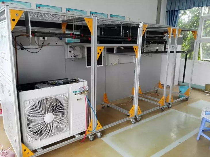 實訓(xùn)裝置采用移動框架4040鋁型材結(jié)構(gòu),安裝好后可固定位置,防止移動而牽動制冷系統(tǒng)管路。整個模擬房頂采用1.5MM的網(wǎng)多功能網(wǎng)孔板設(shè)計使用專業(yè)家用中央空調(diào)專用吊架。掛壁式后安裝板同樣也采用的網(wǎng)多功能網(wǎng)孔板設(shè)計.