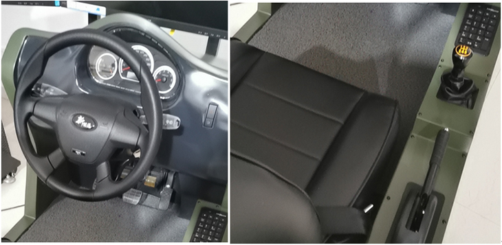 2)開放式艙體,方向盤、變速機(jī)構(gòu)、手制動(dòng)、加油踏板、制動(dòng)踏板、離合器踏板等實(shí)裝主要操作部件均需要模擬,其外觀尺寸、部署相對位置、操作行程,以及操作力度感受與實(shí)際基本一致,操縱機(jī)件性能工作可靠、操作靈活、低噪音。