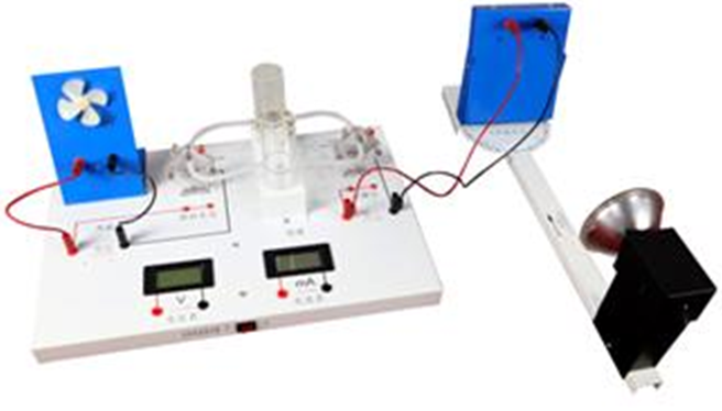 燃料電池教具是利用光線照射在太陽能電池板上產(chǎn)生電能,然后利用產(chǎn)生的電能作用在電解電池模塊上,使水發(fā)生電解產(chǎn)生氫氣和氧氣。氫氣和氧氣進入到發(fā)電模塊產(chǎn)生電能,帶動風(fēng)扇轉(zhuǎn)動。
