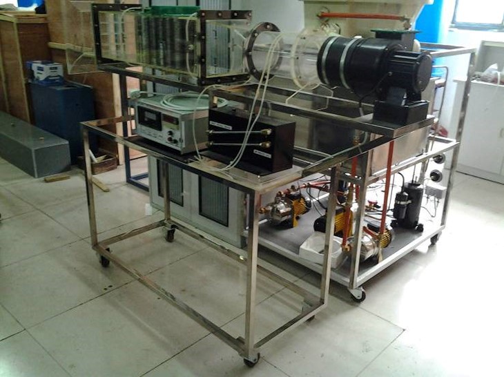 多翼式低噪音風(fēng)機,自動調(diào)節(jié)風(fēng)門,組合式有機玻璃風(fēng)洞,翅片加熱管,加熱由固體調(diào)壓模塊配電位器調(diào)節(jié)加熱功率,數(shù)顯電流表、電壓表,翅片管簇順排和叉排組合,溫度傳感器,畢托管配差壓傳感器測量風(fēng)量,16路萬能信號輸入巡檢儀顯示溫度、阻力、流量,不銹鋼支架。