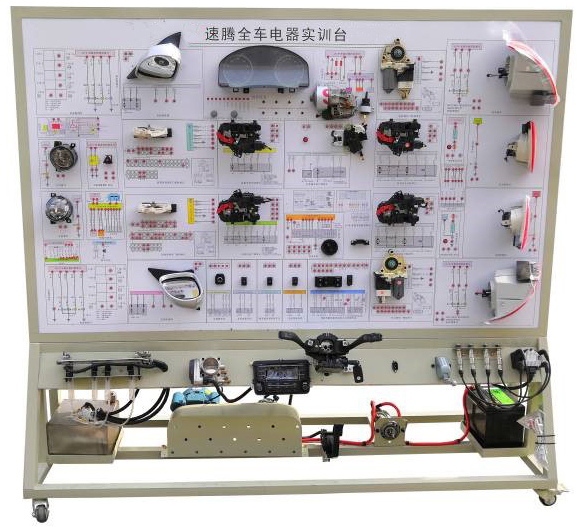 該設(shè)備采用 全新 大眾速騰1.6L 整車電器實物為基礎(chǔ),充分展示汽車發(fā)動機(jī)防盜系統(tǒng)、儀表系統(tǒng)、燈光系統(tǒng)、雨刮系統(tǒng)、喇叭系統(tǒng)、點(diǎn)火系統(tǒng)、電動車窗系統(tǒng)、電動門鎖、音響系統(tǒng)、起動系統(tǒng)和充電系統(tǒng)等汽車電器各系統(tǒng)的組成結(jié)構(gòu)和工作過程。