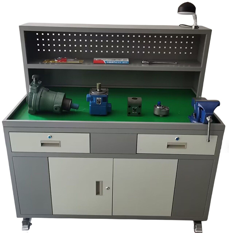 6、實(shí)訓(xùn)臺:采用鈑金結(jié)構(gòu)設(shè)計(jì),表面為雙層亞光密紋噴塑工藝處理,臺面采用下凹設(shè)計(jì),增加臺虎鉗,以及絕緣防滑墊,同時為液壓閥拆裝時提供一個良好的接油、防震平臺。