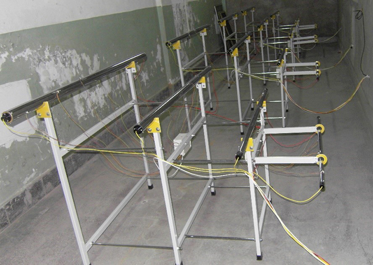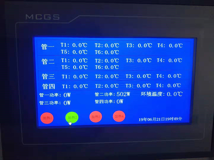 配有四根不同長度和直徑的電鍍紫銅管,管內(nèi)設(shè)置電加熱器;每根管子的表面裝4~6支測(cè)溫傳感器,以測(cè)定其表面平均溫度,測(cè)溫傳感器采用進(jìn)口DS18B20;每根橫管電加熱器配備電子集成固體調(diào)壓模塊無機(jī)調(diào)節(jié)。測(cè)試儀表箱設(shè)有(每根橫管電加熱器)數(shù)顯功率表;所有測(cè)試數(shù)據(jù)由7寸觸摸屏同屏顯示,不銹鋼實(shí)驗(yàn)支架。